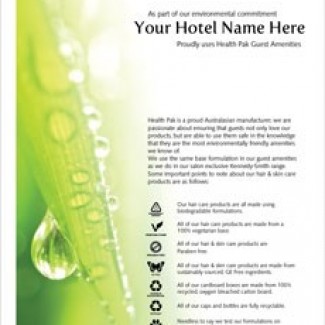 These A4 colour sheets, personalised with your property name are printed out on a light card and are available exclusively for properties that use Health Pak guest amenities. The sheets go into your guest compendium and inform your guests of all the features and benefits of using Health Pak guest amenities. They clearly outline the environmentally friendly benefits of the amenities and by association promote your own environmentally friendly approach to sustainable tourism. Please contact us if you are using Health Pak guest amenities and would like a personalised sheet to go in your guest compendiums.